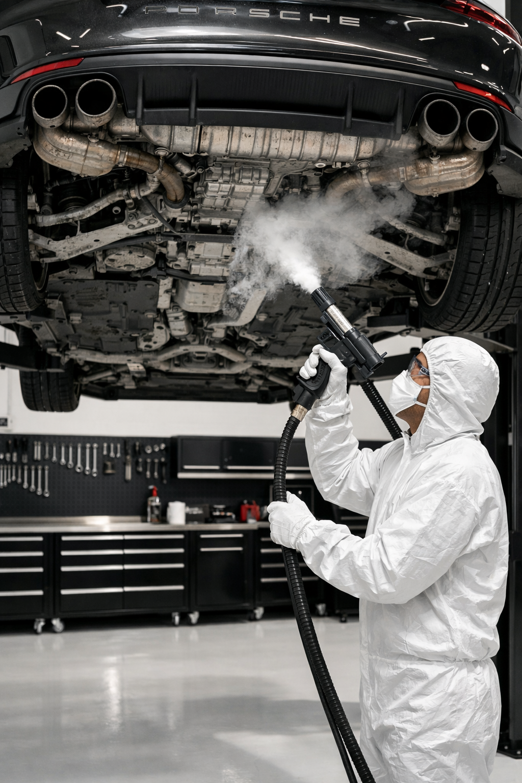 Dry ice cleaning does not remove structural rust or repair metal that has suffered integral damage. It will remove surface contaminants, grease, underseal, and light surface rust or corrosion that has not compromised the underlying material, while preserving factory coatings and original finishes when they are in good condition.